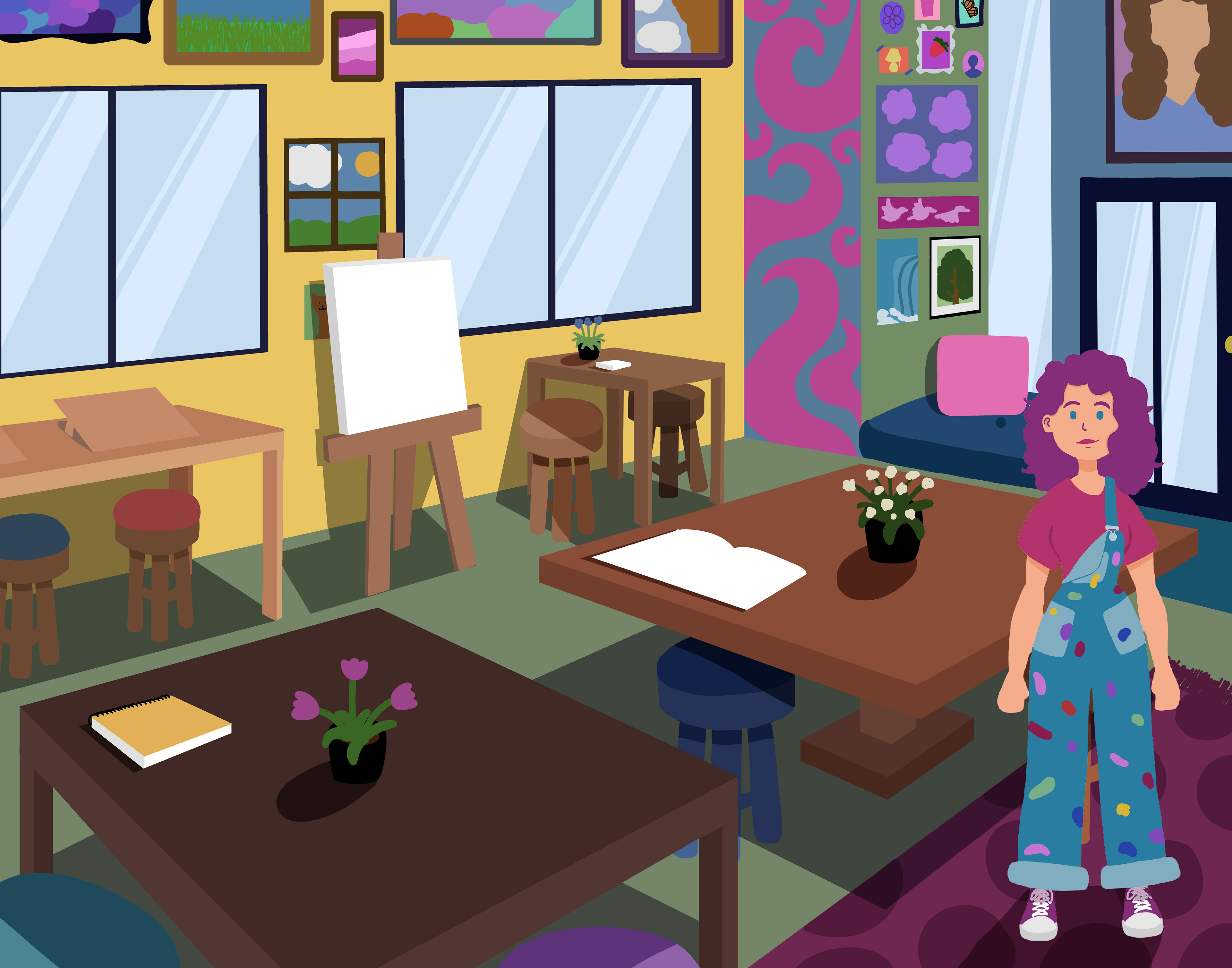 I wanted to illustrate a cafe space catered to artists and create a character to fit into that space. As an artist cafe, there are easels for painting and drawing stations, and colorful interior design and art filling the walls.